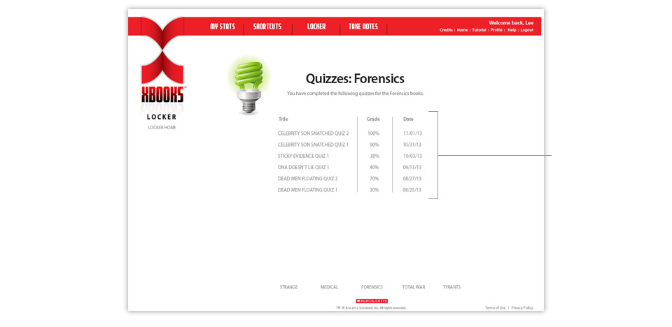 The Quizzes screen shows the quizzes you have completed for a strand, your scores, and the date you completed the quiz. You can select the title of a quiz to open the graded quiz.