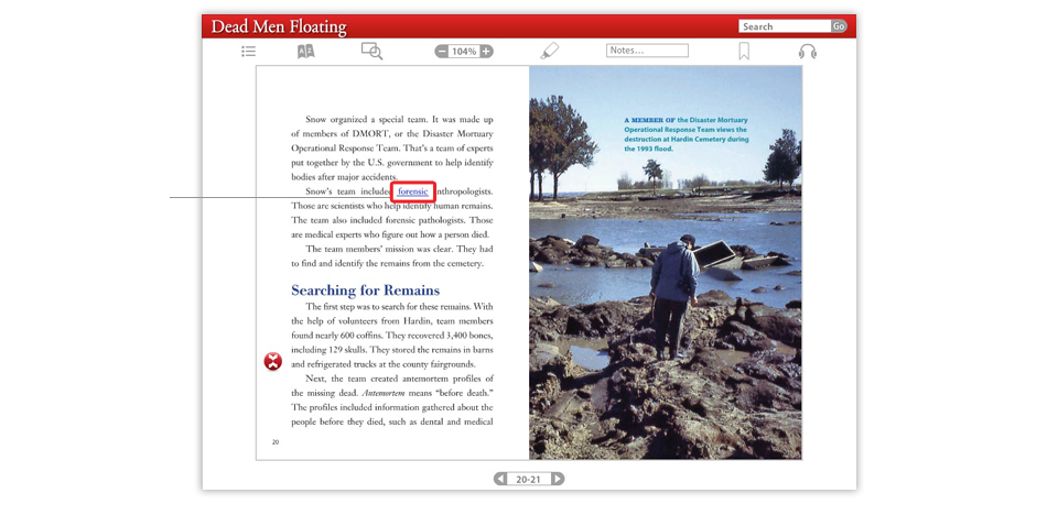 Five academic or content-area words are highlighted in each eBook. Select a blue, underlined word to open a Vocabulary Pop-up.