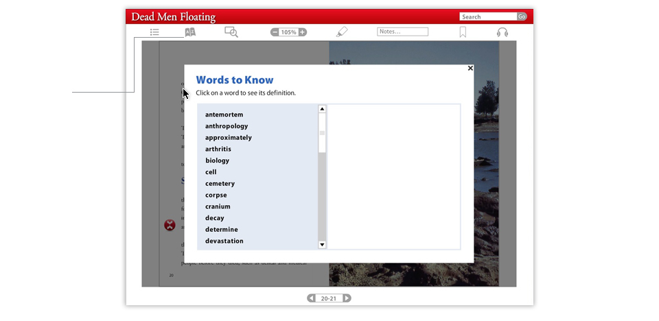 Selecting this icon will display Words to Know, shown here. Words to Know provides pronunciations, parts of speech, and definitions for key vocabulary words within a strand.