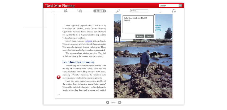 You can select this icon to take a note about the book. Write your note and select Save. A notes icon will appear. Drag it to the part of the page the note relates to. Your note will be automatically stored in a notepad in your Locker.