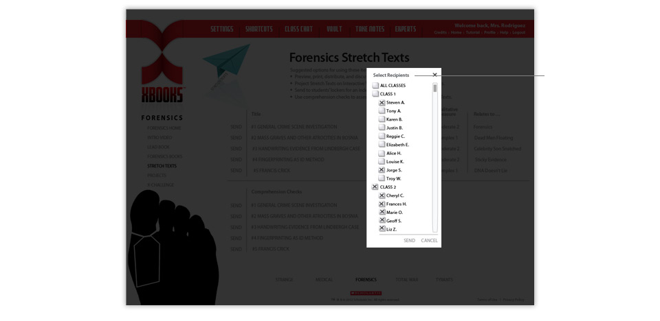 Mark the boxes next to the classes or students to whom you'd like to send the Stretch Text or Comprehension Check. Then select Send at the bottom of the pop-up window.