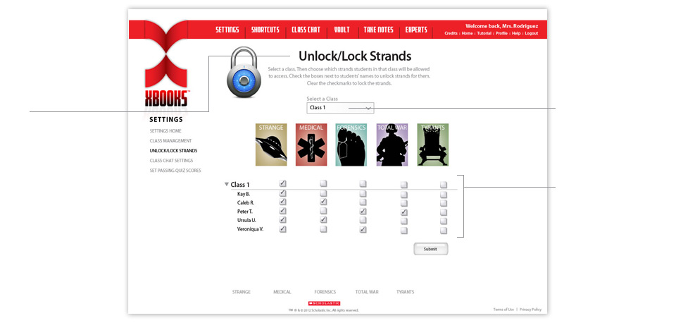 This is where you control which XBOOKS strands your students and classes can access. The default setting is for the STRANGE strand only to be unlocked.