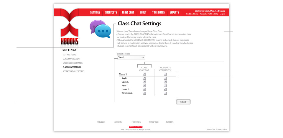 By checking the boxes in this column, you can give a class or individual students access to Class Chat. Clear the checks to turn Class Chat off.