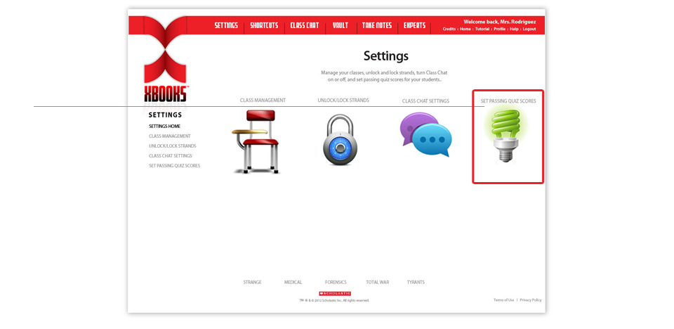 From the Settings Home screen, select the Set Passing Quiz Scores icon.