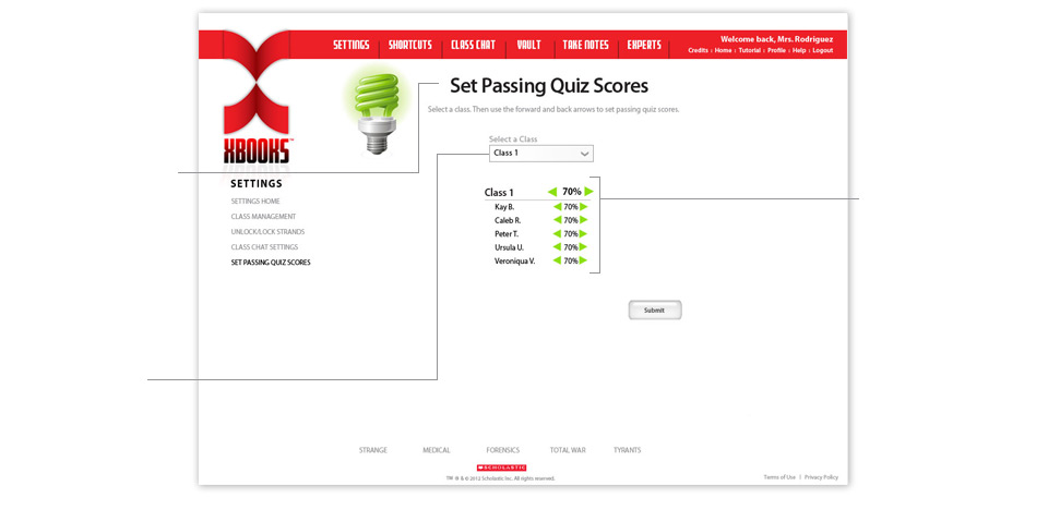 This is where you can customize passing quiz scores for a class or for individual students. The default passing score is 70%.