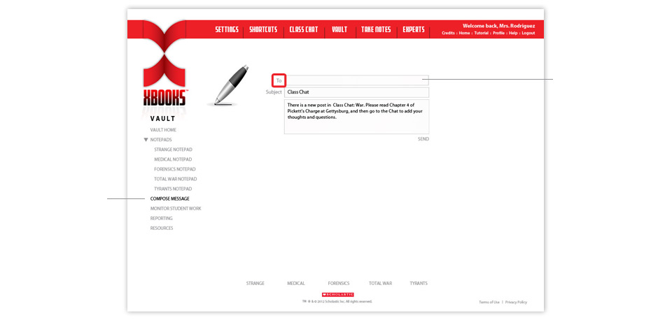 Here you can compose and send messages to students or classes. This function is useful for suggesting XBOOKS Projects for your students or alerting them to recent posts in Class Chat.