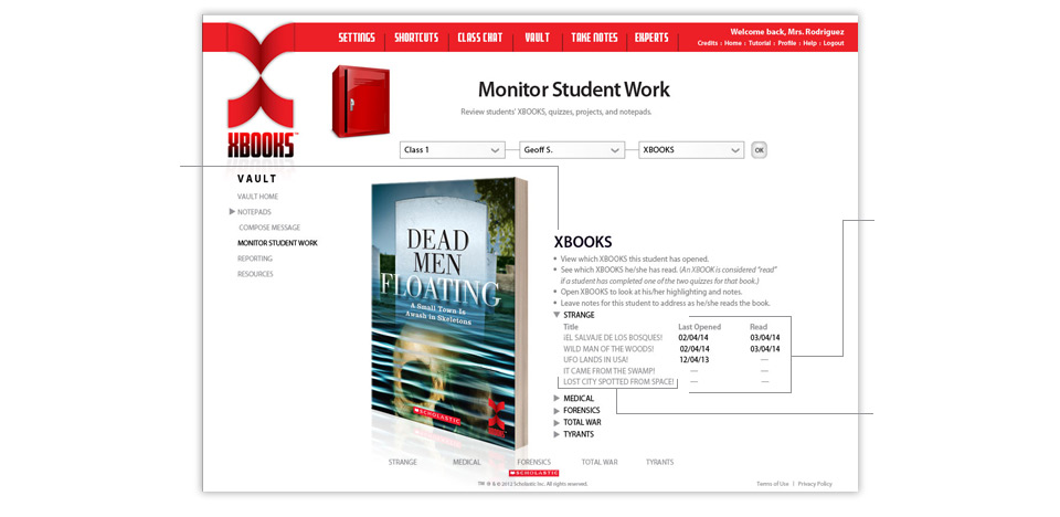 You can open eBooks to view a student's notes and highlights and to leave notes for him or her. All of a student's books are available to you, whether the student has opened them or not.