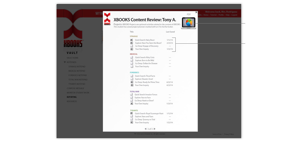 Project Planners marked with an X have been saved online by the student.